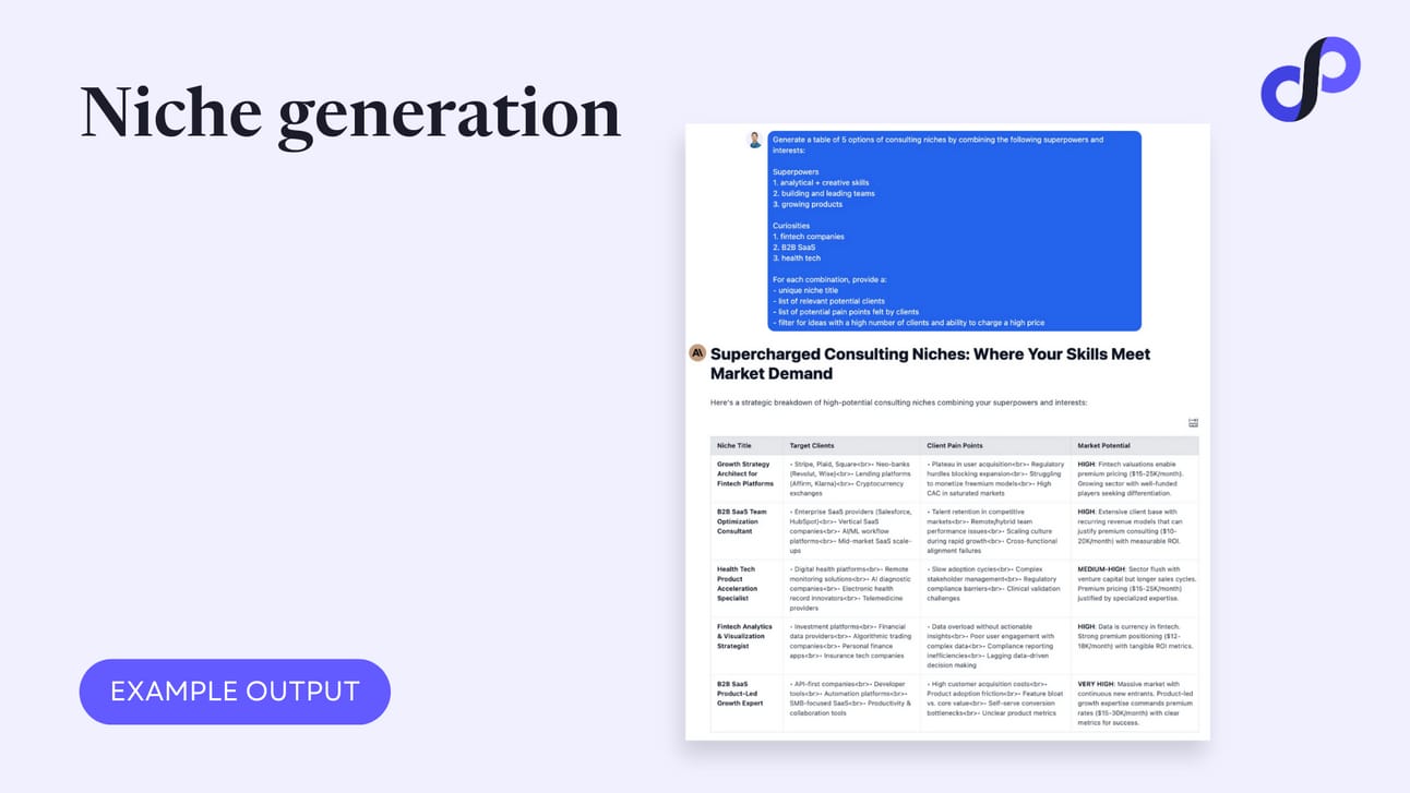 Prompt: âGenerate a table of 5 options of consulting niches by combining the following superpowers and interests: [insert strengths and curiosities]â
