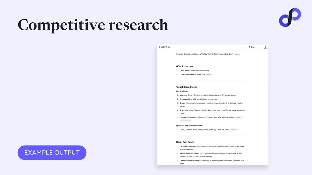 Prompt: âYou are my market researcher. Analyze the following consulting service webpage and break down their offer in detail: https://kaliber.asia/services/performance-branding/