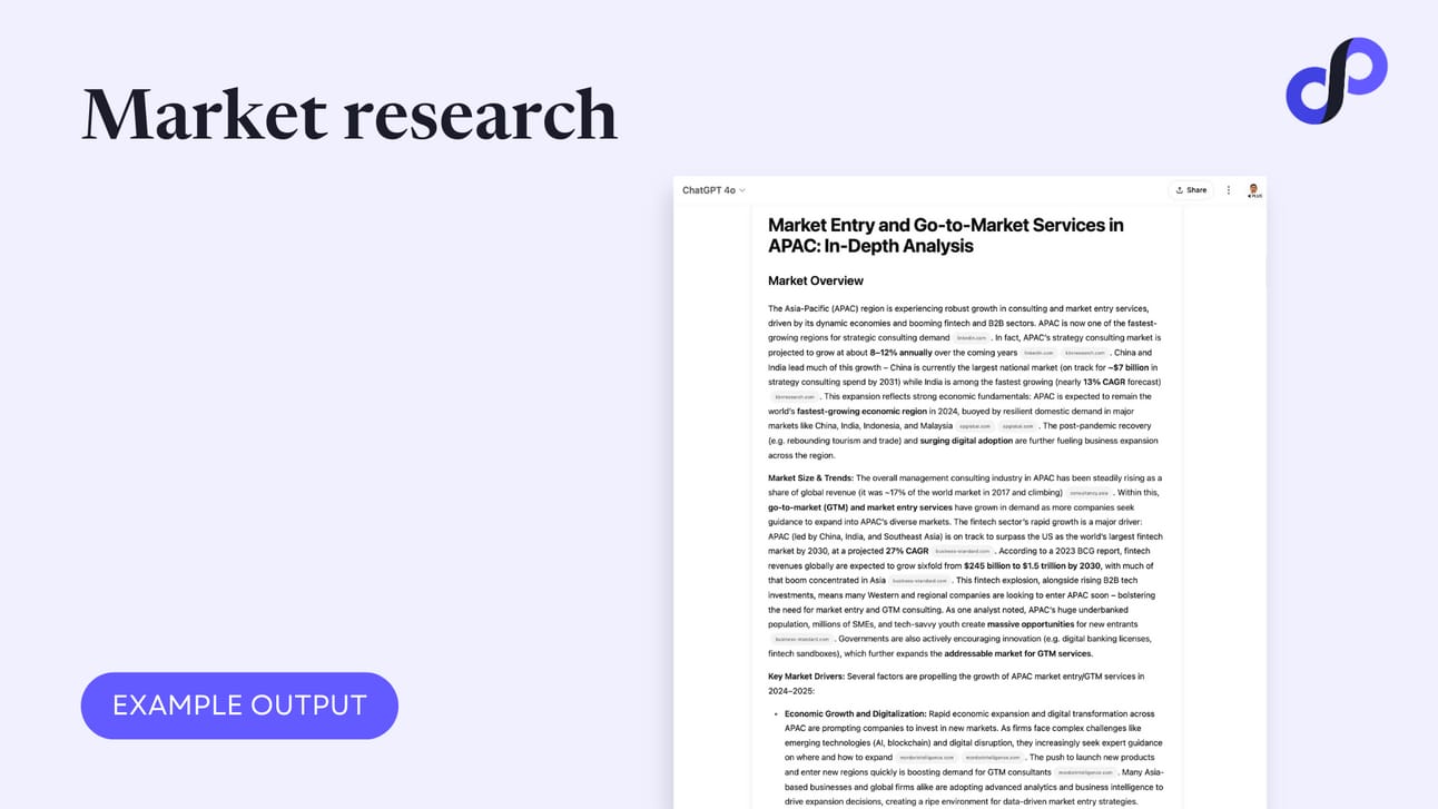 Prompt: âConduct an in-depth market research analysis on APAC market entry services for my own independent growth consulting firm.