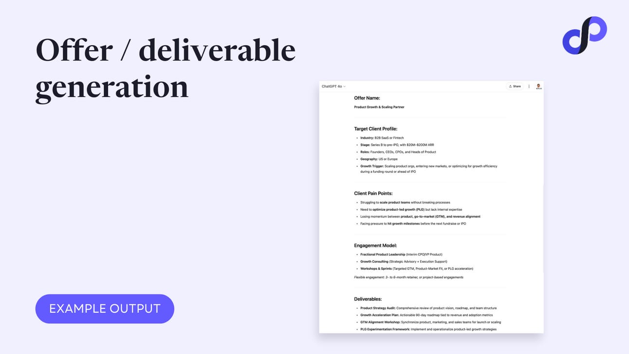 Then, generate an offer draft including: Offer name, target client profile, client pain points, engagement model, deliverables (bullet point list), pricing model, value proposition"