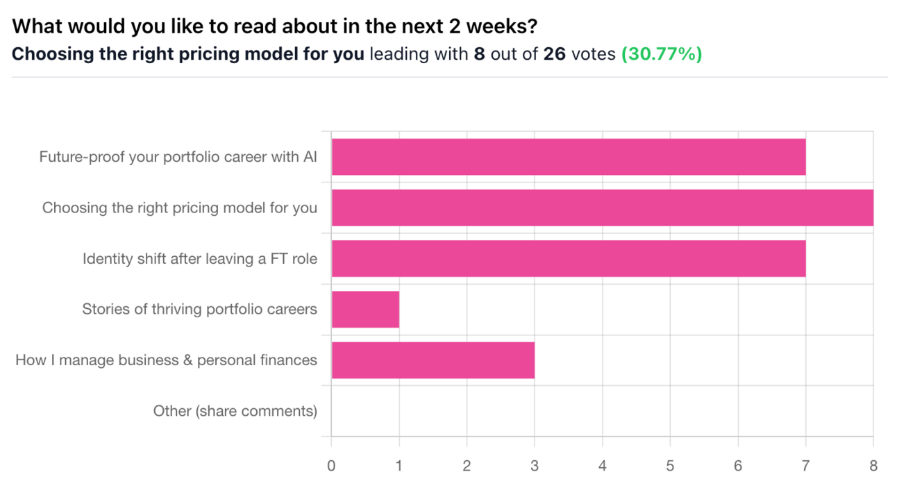 Thanks to everyone who voted! The top-voted topic was pricing, but it was a close call. This worked well, so Iâll include polls periodically :)
