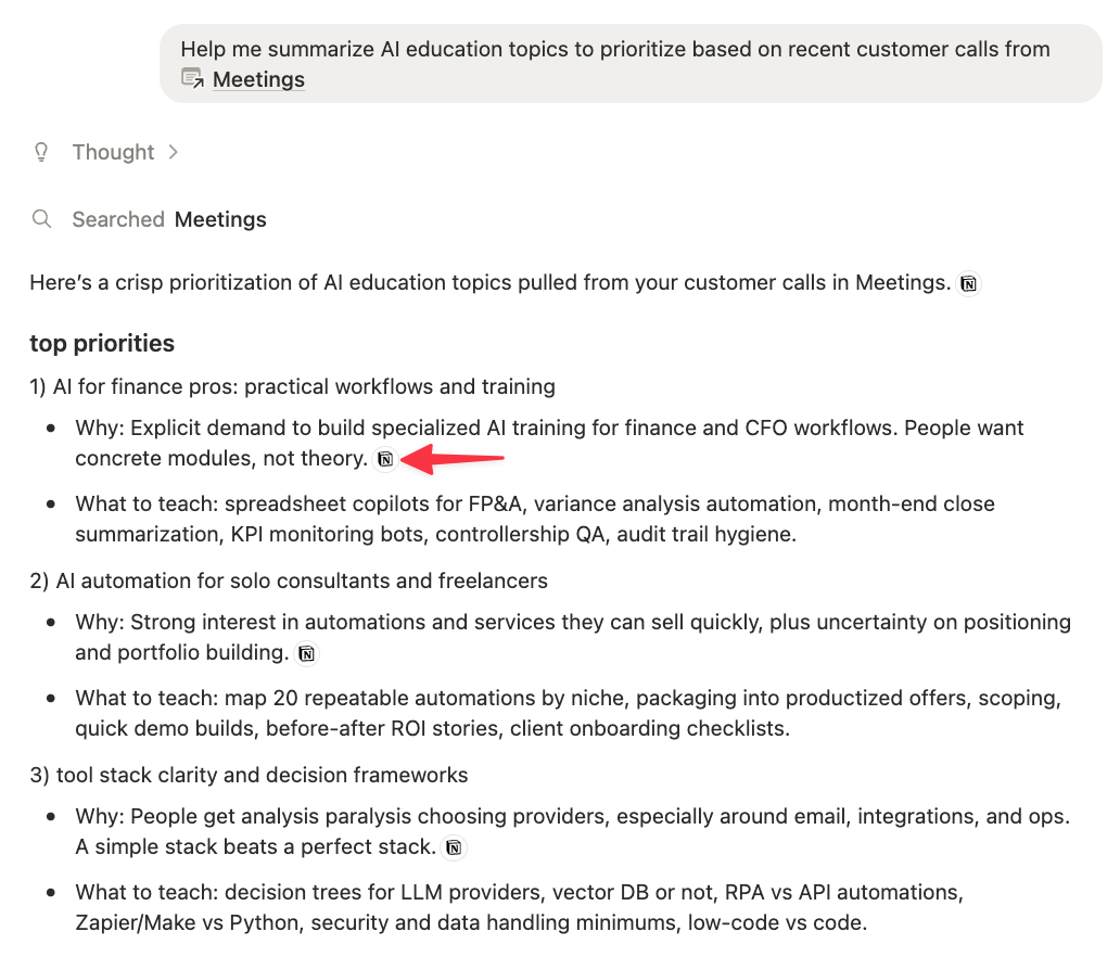 One pro of doing this is Notion AI is now good at referencing source pages - so if you have meeting notes in separate pages, it’ll link the citation: