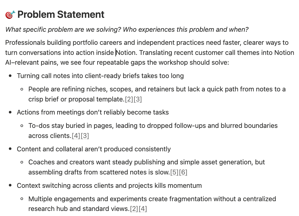 For example, here’s an output I generated for planning my Notion AI Workshops with citation links.