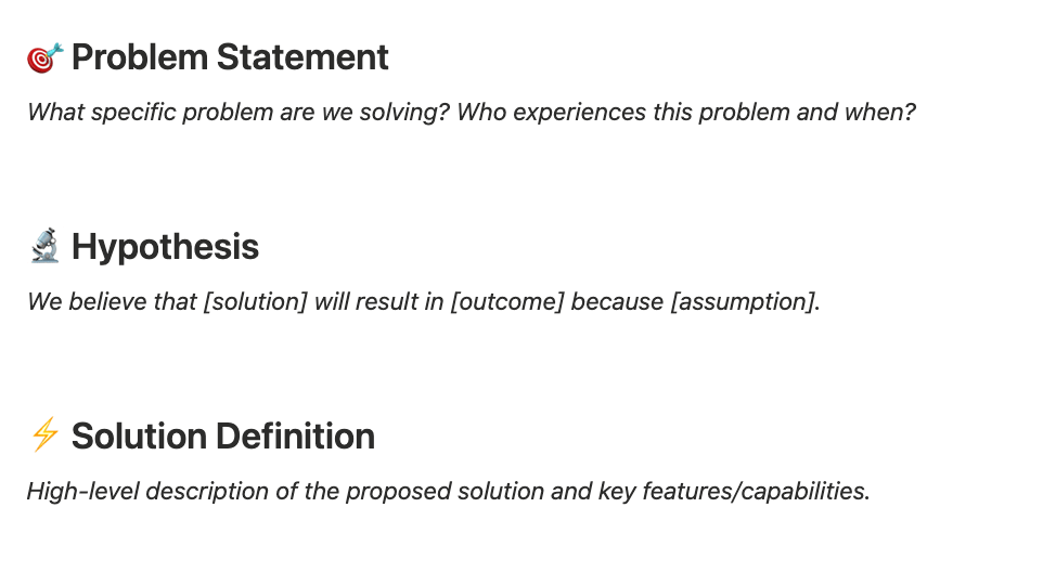 First, I’ll setup a planning doc template. I like to write section headers and short descriptions to describe what goes into each section to help guide AI (much like guiding a human).
